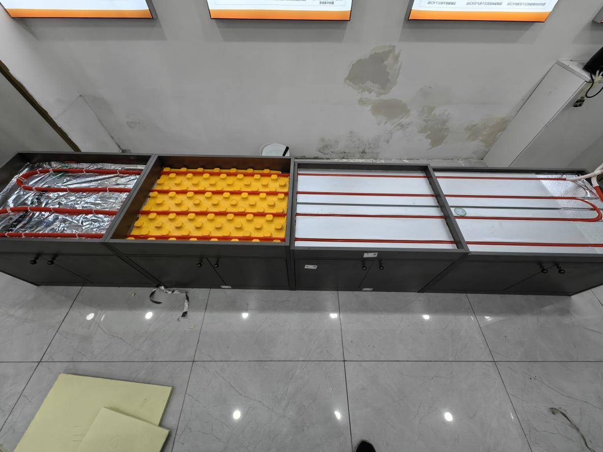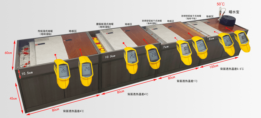 3、摸到差异:地板对地板、地砖对地砖用手摸到表面温度明显差异,背面对背面摸透热温度差异,从而真实感受不同地暖的效果差异和背面透热的节能差异。